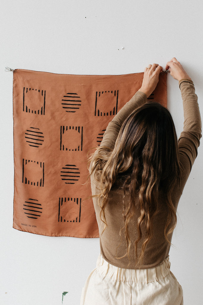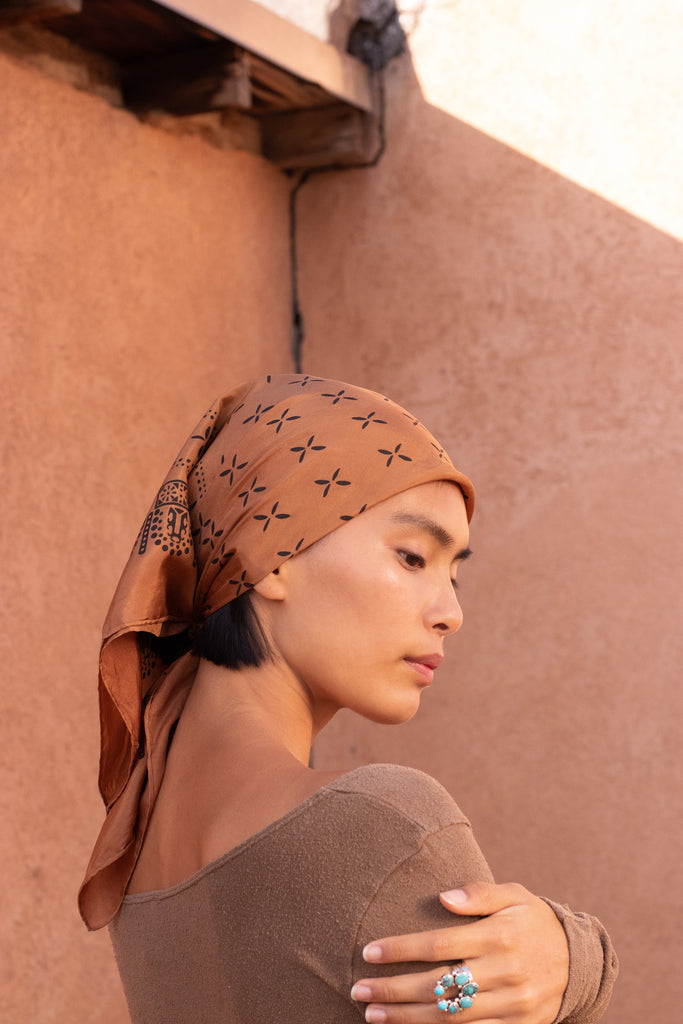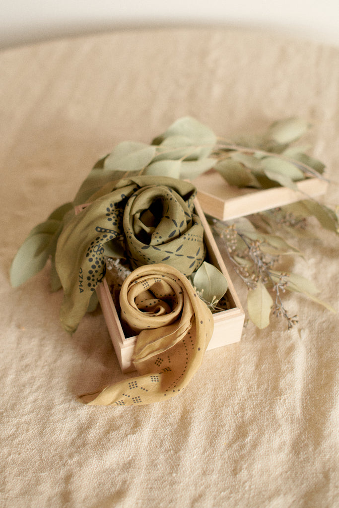 Thoughtfully made by hand—screen printed on airy silk and dyed into soft, earthy, natural hues in small batches in Los Angeles—these are as luxurious as they are sustainably made. The perfect marriage between beauty and utility, we designed them to be used like our favorite vintage scarves: as headband, hair tie, timeless style statement, or bindle for just-picked berries or gathered seashells etc. And, of course, they make a wonderful gift for anyone—including yourself.