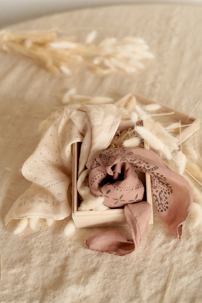 The '1930's Bandana and Hankie Gift Box, Earth' calls to mind the dusky roses and pale quartz of desert in twilight. Contains our 1930's Bandana in Rosehip and Dot Hankie in Bare.