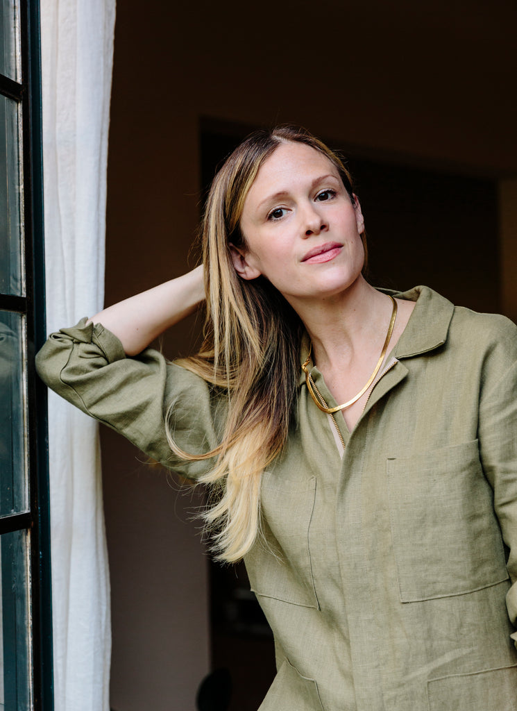 Lia wears the Eva Jumpsuit in Pale Avocado