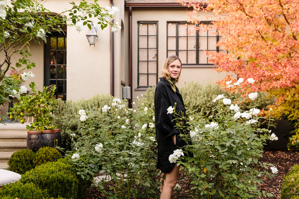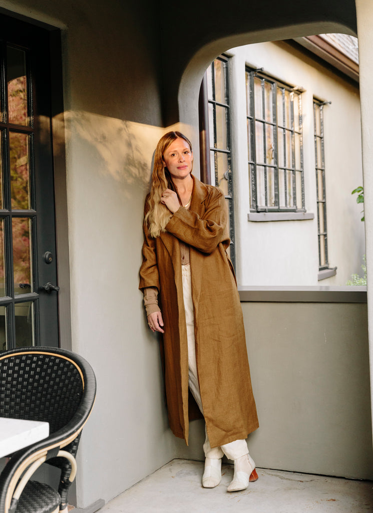 Lia wears the Carolina Trench, Rae Cardigan, and Utility Pants
