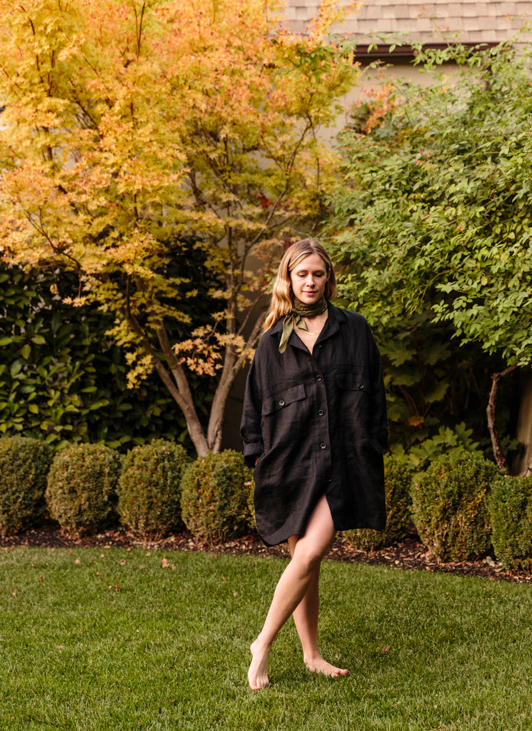 Lia wears the Audrey Shirt Jacket and 1930's Bandana in Avocado