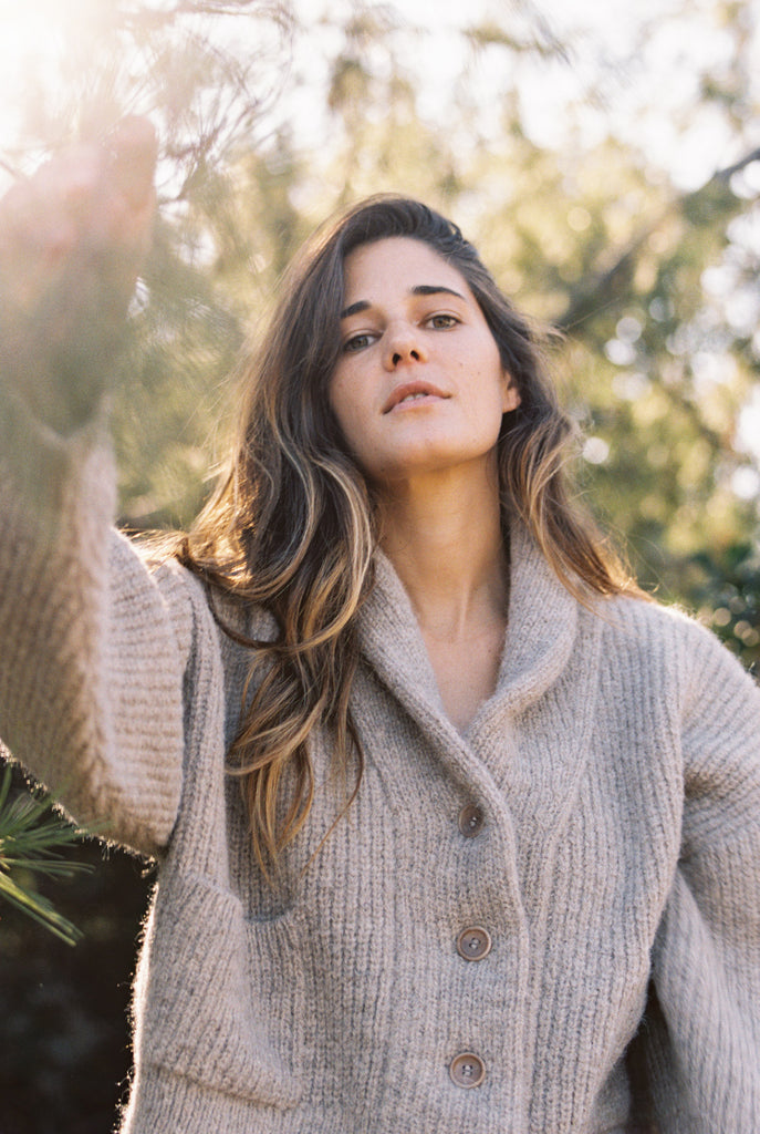 Ally wears the Sloan Cardigan and 1930's Bandana in Rosehip
