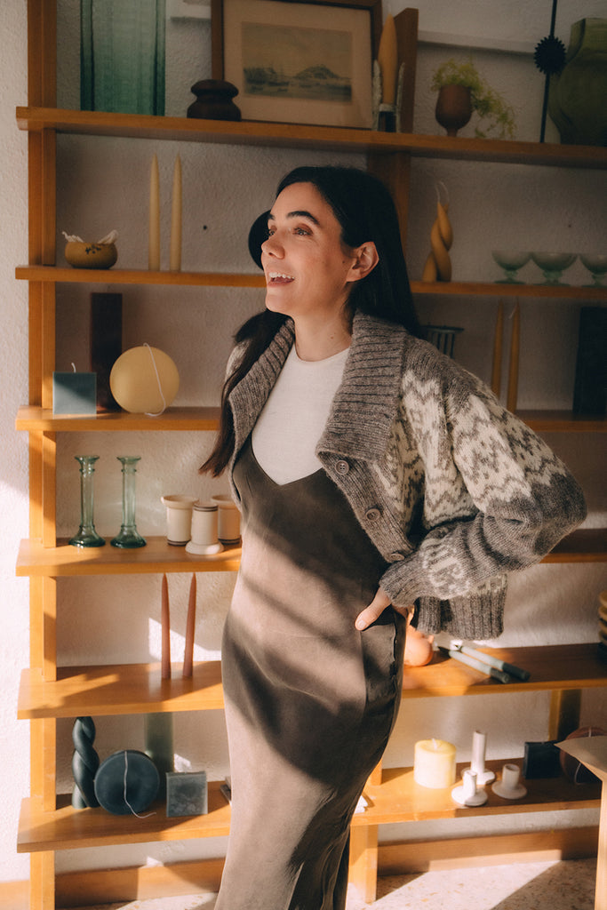 Clara wears the Cabin Cardi, Lou Tee, and Anaise Slipdress.