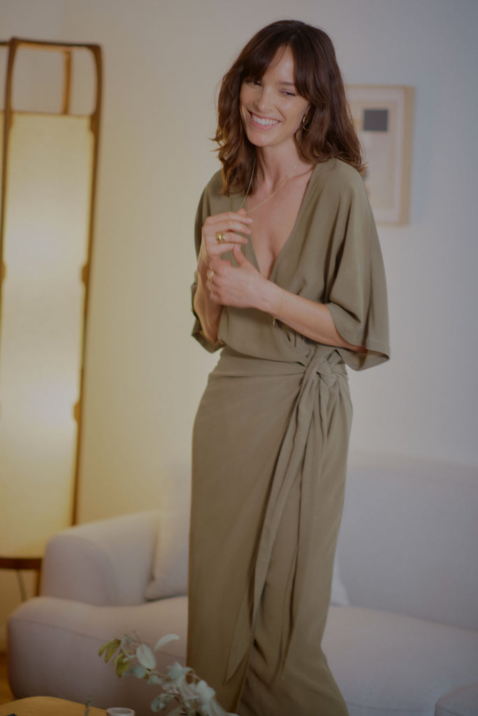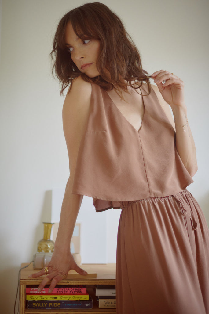 Jodi wears the Edo Top and Kyoto Pants in Cedar