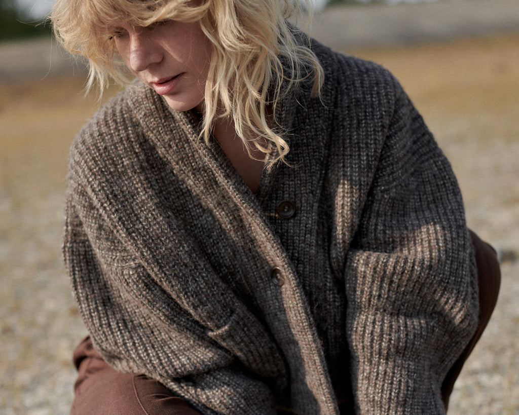 Maxine wears the Sloan Cardigan in Root and Utility Pant.