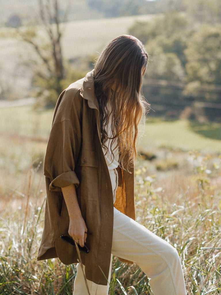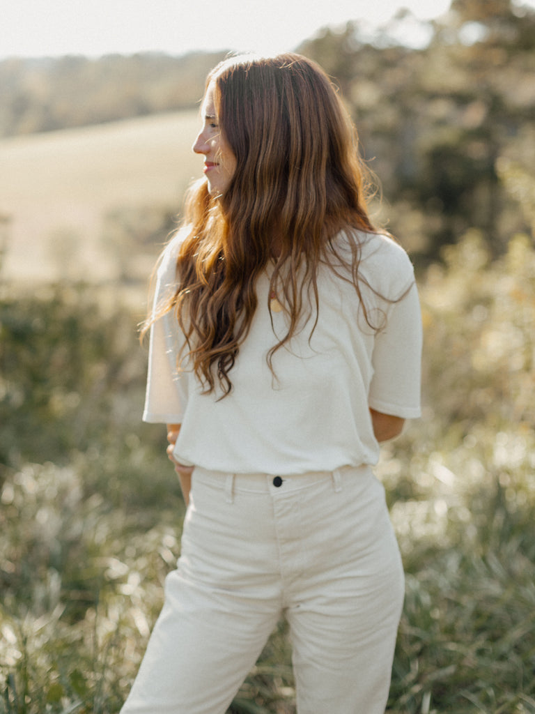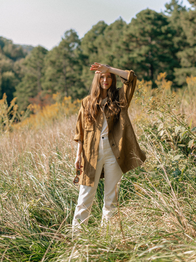 Emma wears the Audrey Shirt Jacket, Oversize Tee and Kate Jeans