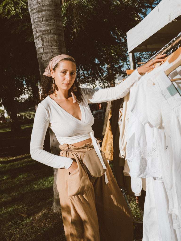 I have a really beautiful seventies shearling coat that I absolutely love. I also wear my OZMA Sophie Crop in white all of the time with lounge pants so I can still feel cute when I’m relaxing.
