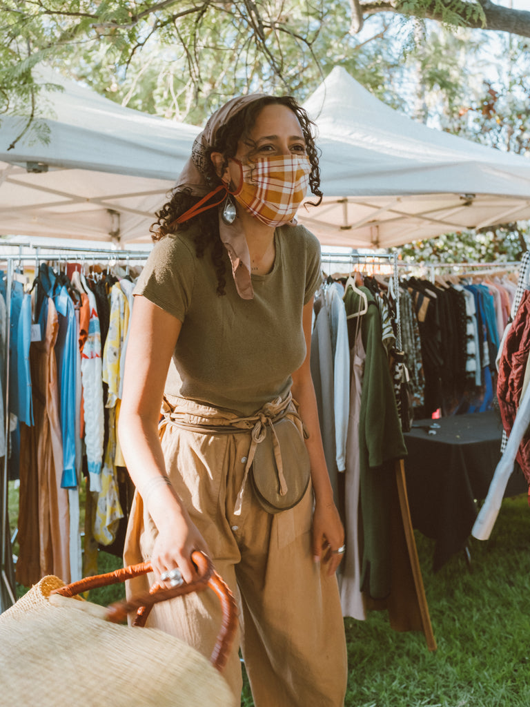 Natasha wears the Lou Tee in Military Green, and 1930's Bandana in Oak.