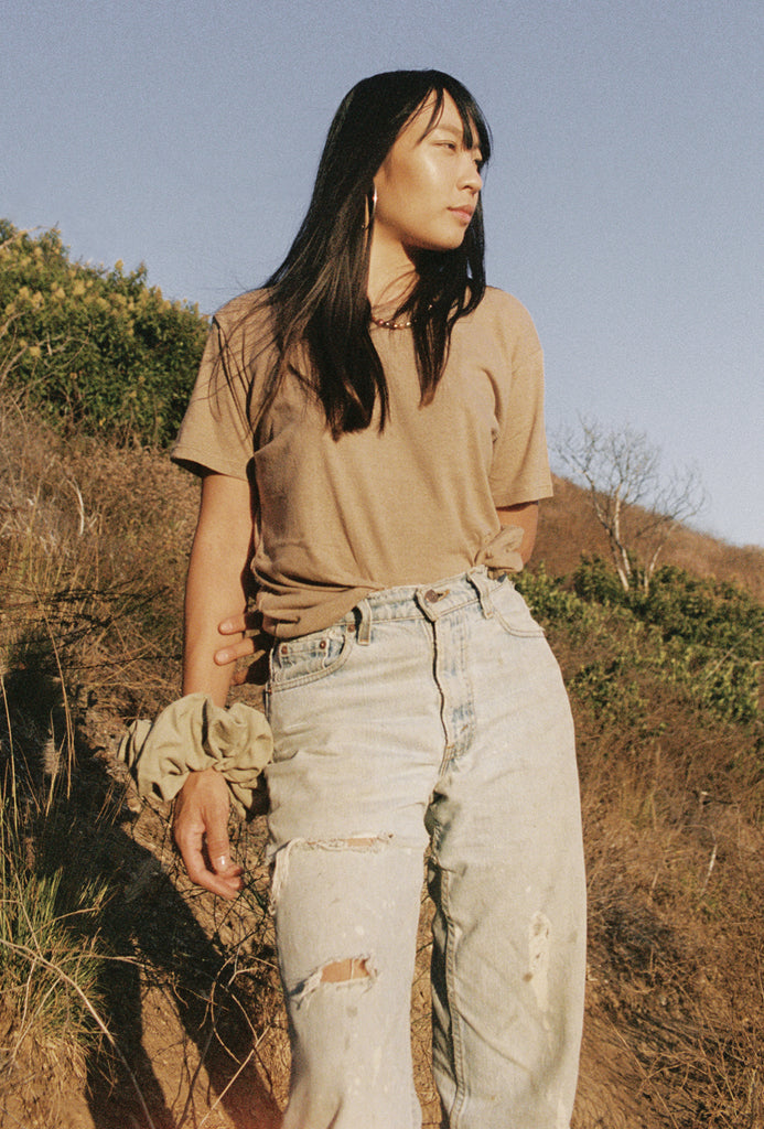 Sandy wears the Boxy Oversized Tee and No Waste Scrunchie.