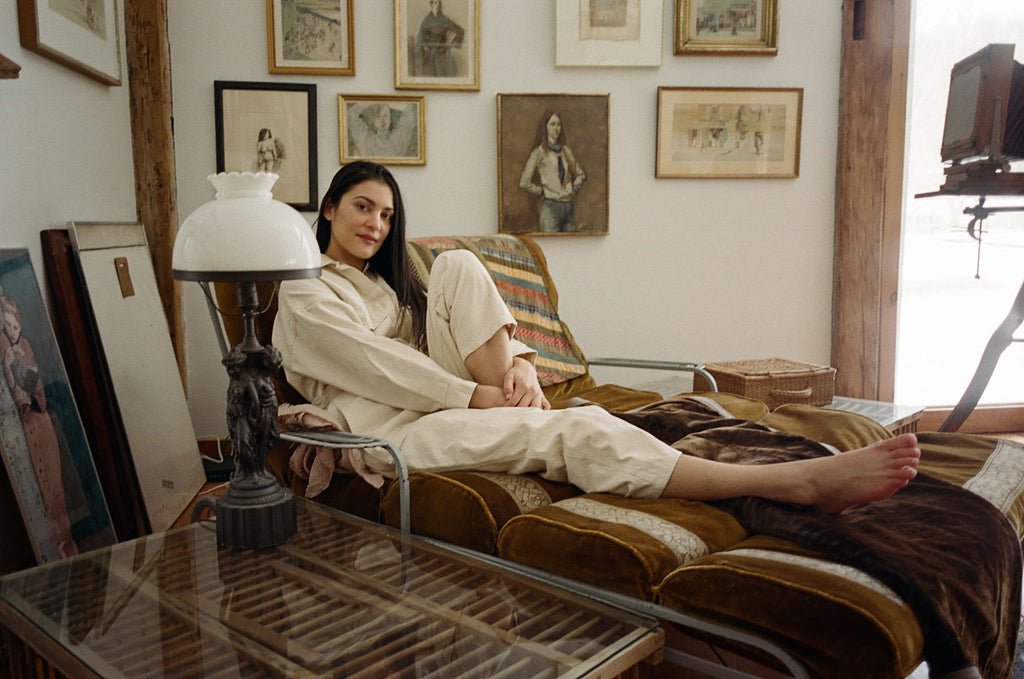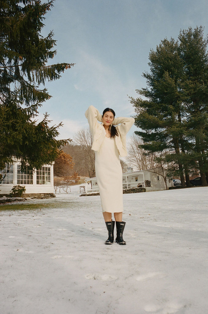 Tafv wears the Bias Slip Dress in Natural and Finley ZipUp in Cream.