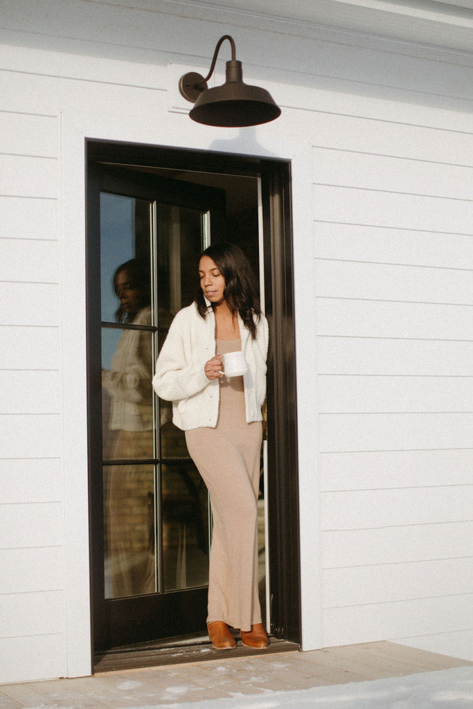 Alyson wears the Sloan Cardigan and Claudia Dress.