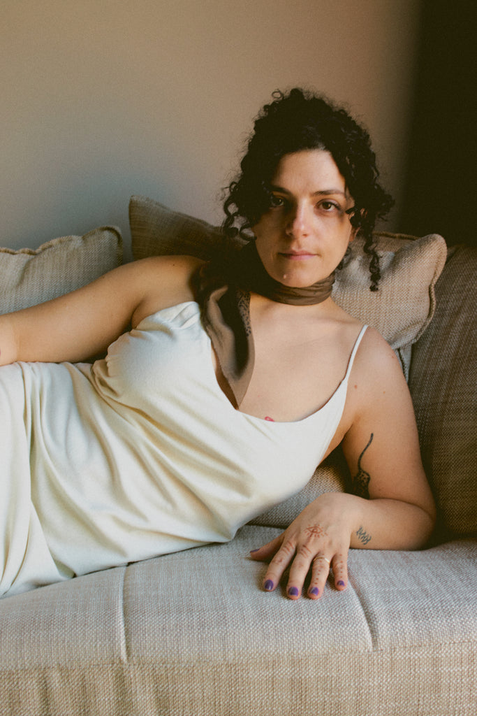 Céline wears the Bias Slip Dress and 1930's Bandana.