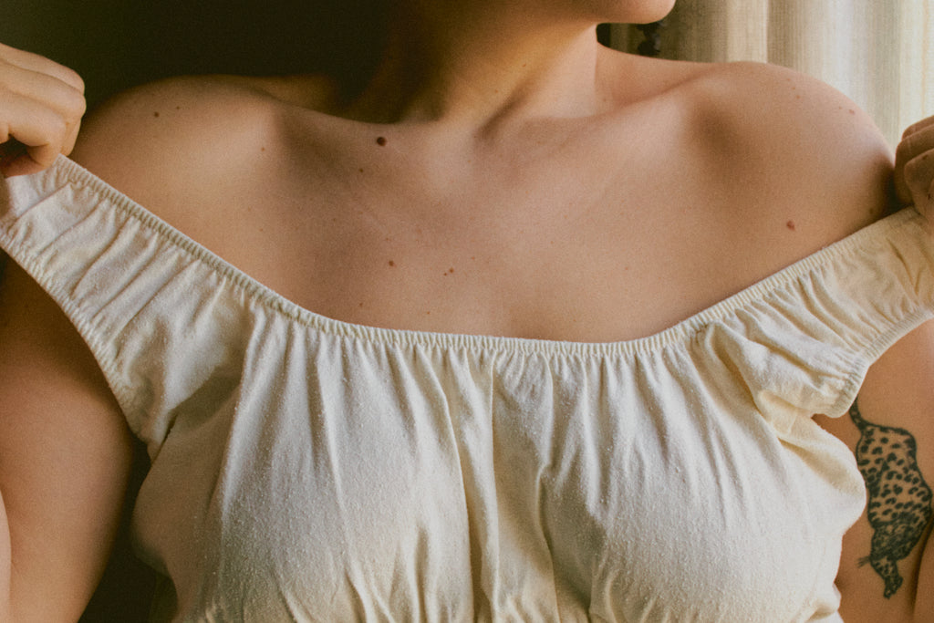 Céline wears the Audrey Shirt in Organic Manta Cotton.