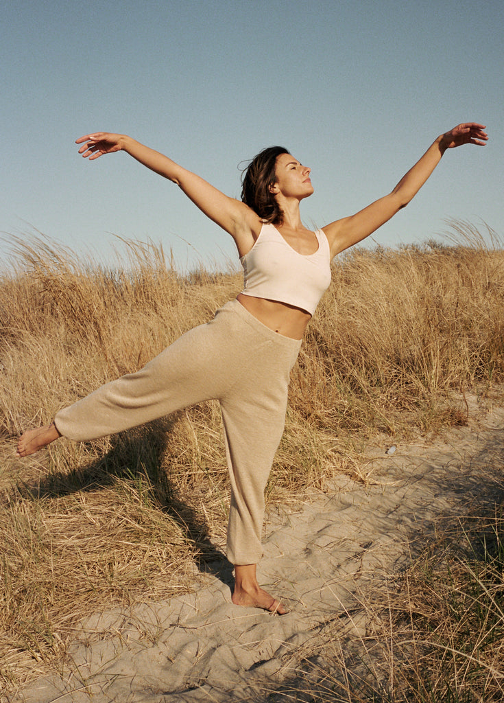 Jules wears the Reva Tank (coming soon!) and the Dara Pant.