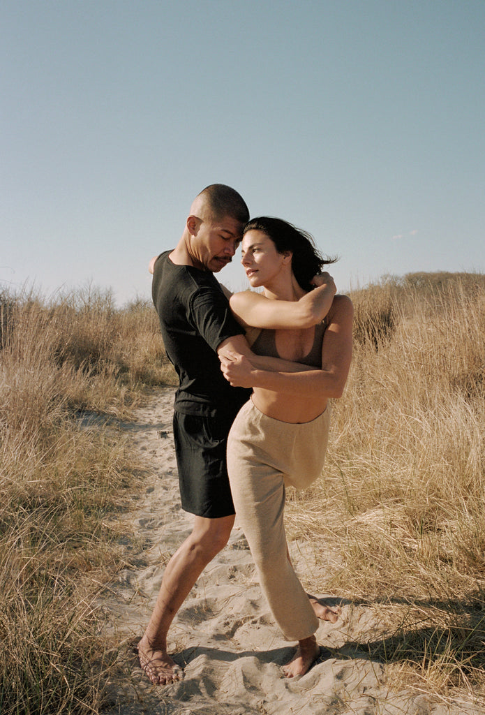 Julius wears the Oversized Tee and Loie Short. Jules wears the Verona Bralette and Dara Pant.