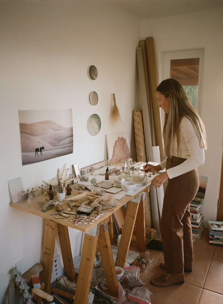 So much of my work the past ten years has traced a cosmology of color, drawing from my memory of the rock and dirt that surrounded me on camping trips with my mother as a child. Tracing my own origins back to the moments that formed me when I was little, driving in my mother’s butter colored station wagon, sleeping surrounded by pink canyon walls under the stars. The elements in our bodies, in the dirt, in the stars that fall, they are all made of the same things. And as I get older I find myself moving in circles around the places and materials of origin that shaped me as a child. I find myself returning with my own children to the campsites where I went with my mother when I was little. I find myself making paint from rocks collected along the edge of the highways I used to drive with my mom on our way to go camping. We are more connected than we realize to the land, and part of growing older is remembering that deep connection, recovering that lost self, finding ways to honor the land that formed us.