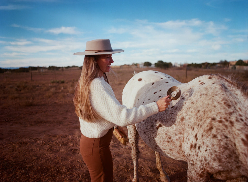 When I was little my mother had an appaloosa horse, and I’ve been wanting one as long as I can remember. Last winter my husband’s sister Morgan, who has been rescuing slaughterhouse bound horses for twenty years, found an appaloosa in a kill pen in Texas. That weekend I sold enough paintings to buy her, and we had her trailered to our little ranch in New Mexico. She was very frightened and malnourished when she arrived, but longed to be touched. Our oldest child Wyeth named her Moon and Stars. Over the past ten months we’ve fed her wild grasses and hay and grains and she’s slowly come back to health. I started riding her this past summer, after months of building up trust and a sense of touch. She is wild and always teaching me to trust.